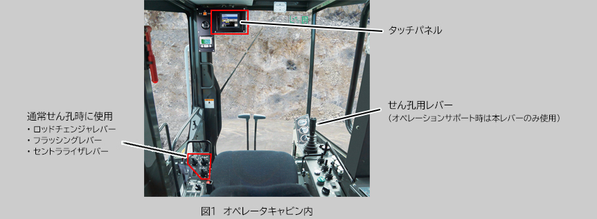 通常のせん孔作業では、せん孔用、ロッドチェンジャ用、フラッシング用、セントラライザ(※4)用の4つのレバー(図1)を複合的に操作しますが、オペレーションサポートシステムでは、せん孔用レバーの前進と後進のみ(ワンレバーアクション)でせん孔が可能となり、通常のせん孔作業に比べ、オペレータのレバー操作回数を約70%削減します。