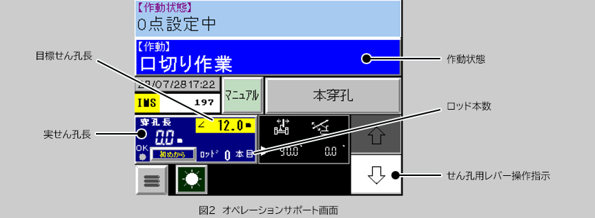 タッチパネル画面では、マニュアル操作⇔オペレーションサポートシステムの切り替えが可能です。オペレーションサポート画面(図2)では、作動状態、目標せん孔長、実せん孔長、ロッド本数を表示します。また、せん孔用レバーの操作指示を矢印で表示し、オペレータのせん孔作業をサポートします。