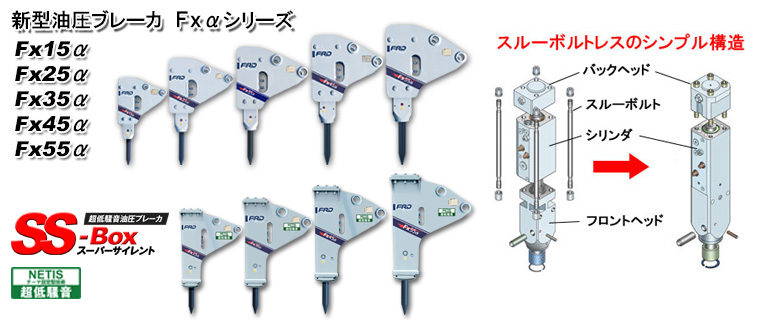 Fxjの超低騒音仕様(SS-Box)は、ボックスフレームをベースに遮音性・吸音性のあるフロントダンパ、サイドダンパの配置、ロッド部の遮音性を高めるボトムスペーサ、プロテクトシール等の配置、ブレーカ上部およびホース取付け部からの音漏れを防ぐカバー類の配置などを行いました。