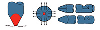先端がとがっているため、対象物にささりやすく、くさび効果も加わって対象物を破砕します。